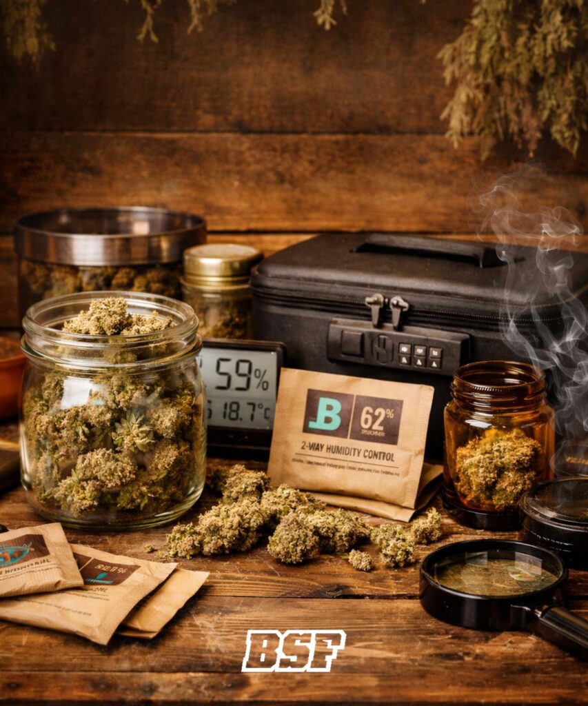 - Sobres reguladores de humedad 58 % o 62 % para conservar terpenos y evitar excesos