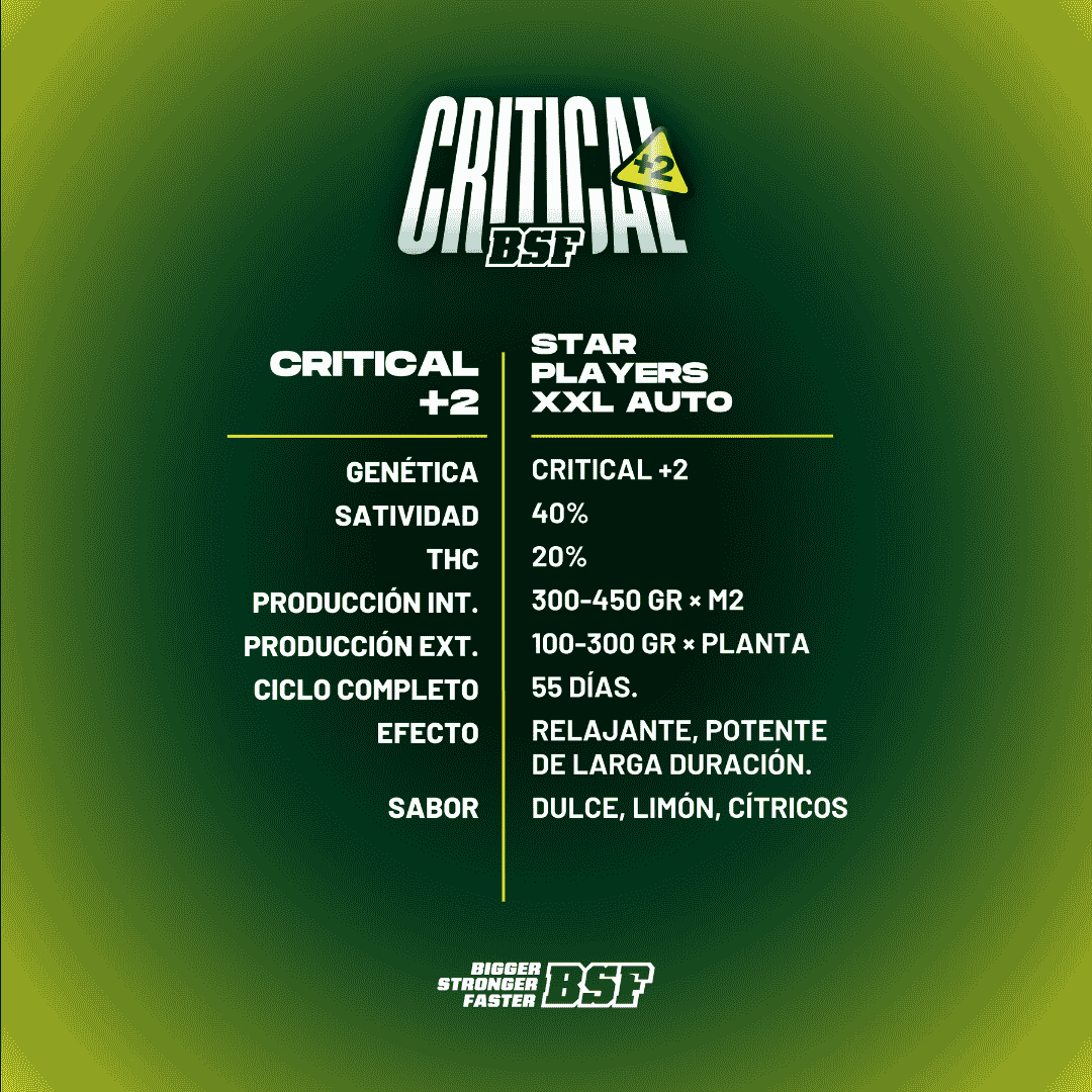 Critical + 2 XXL Auto es una gran genética para tu colección e ideal para compartir una rica comida, una tarde de risas con amigos o un buen libro.